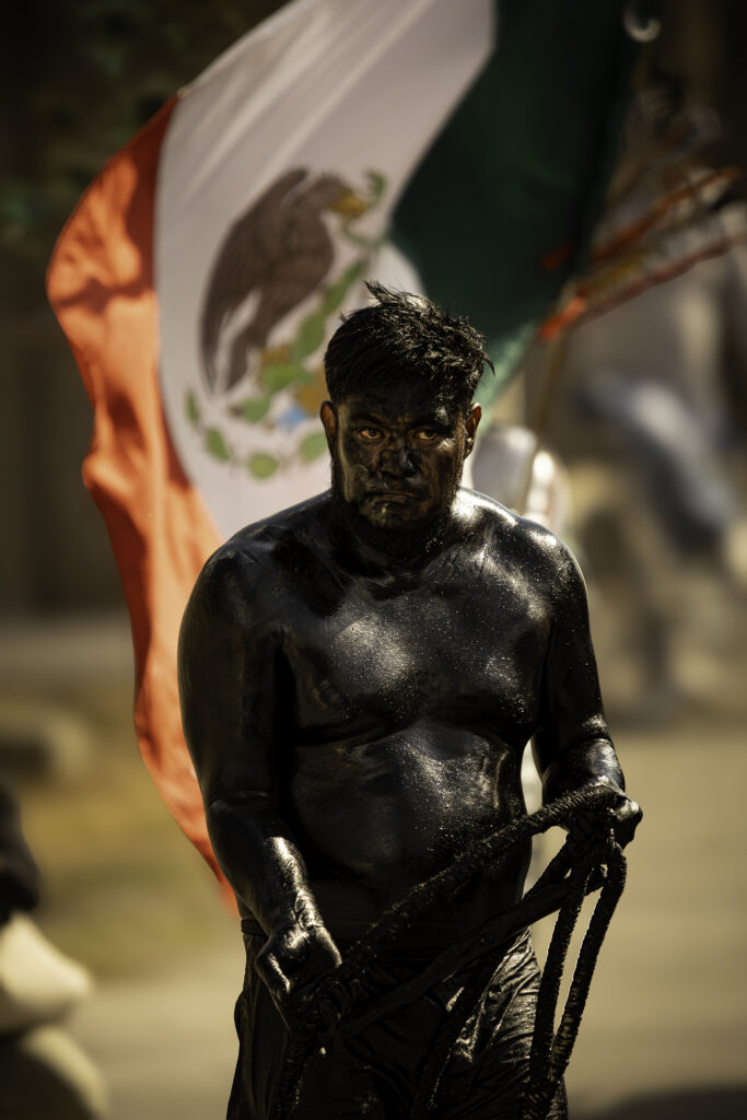 Alfredo se detuvo en un detalle que muchos no notarían a simple vista: lo que parece pintura no es pintura. “Eso que ven no es pintura, es aceite… aceite de motor”, dijo, hablando también del calor, el sol, el sudor, el alcohol y la mezcla de olores que rodea la escena. El resultado, sin embargo, es una imagen sorprendentemente tranquila. Él mismo lo explicó: esperó y cazó el momento. “Lo estuve cazando como un minuto para que no me estorbara nadie y disparar en ese momento”. Lo que no se ve en su foto es lo que da aún más valor a su mirada: “hay baile, hay música… es toda una fiesta… y en los costados hay mucha gente”.