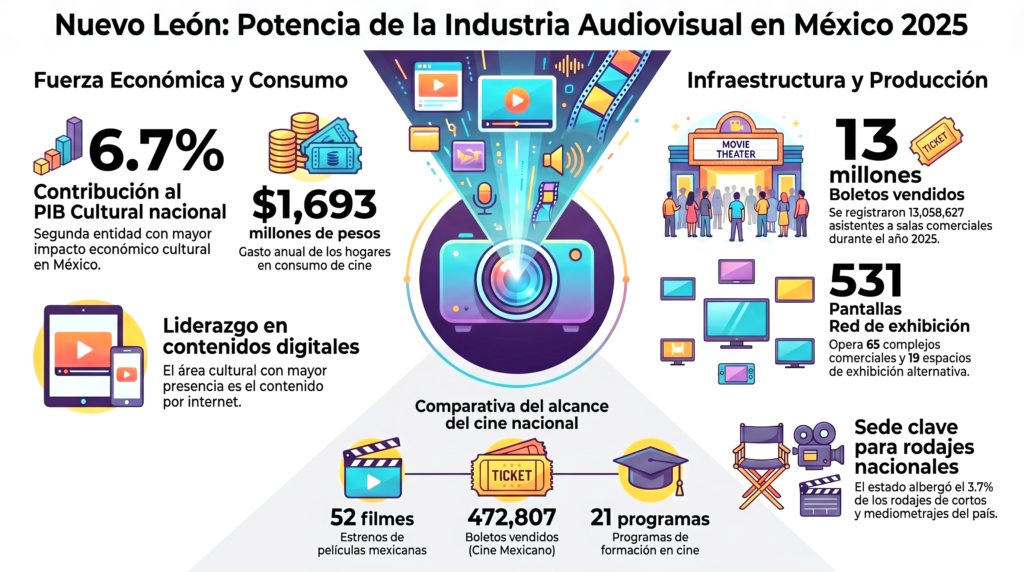 Nuevo León desempeña un papel fundamental en la industria cinematográfica y audiovisual de México, destacando tanto en su capacidad de producción como en su infraestructura de exhibición y consumo cultural. Según los datos del sector registrados durante 2025, el impacto del estado se resume en los siguientes puntos: