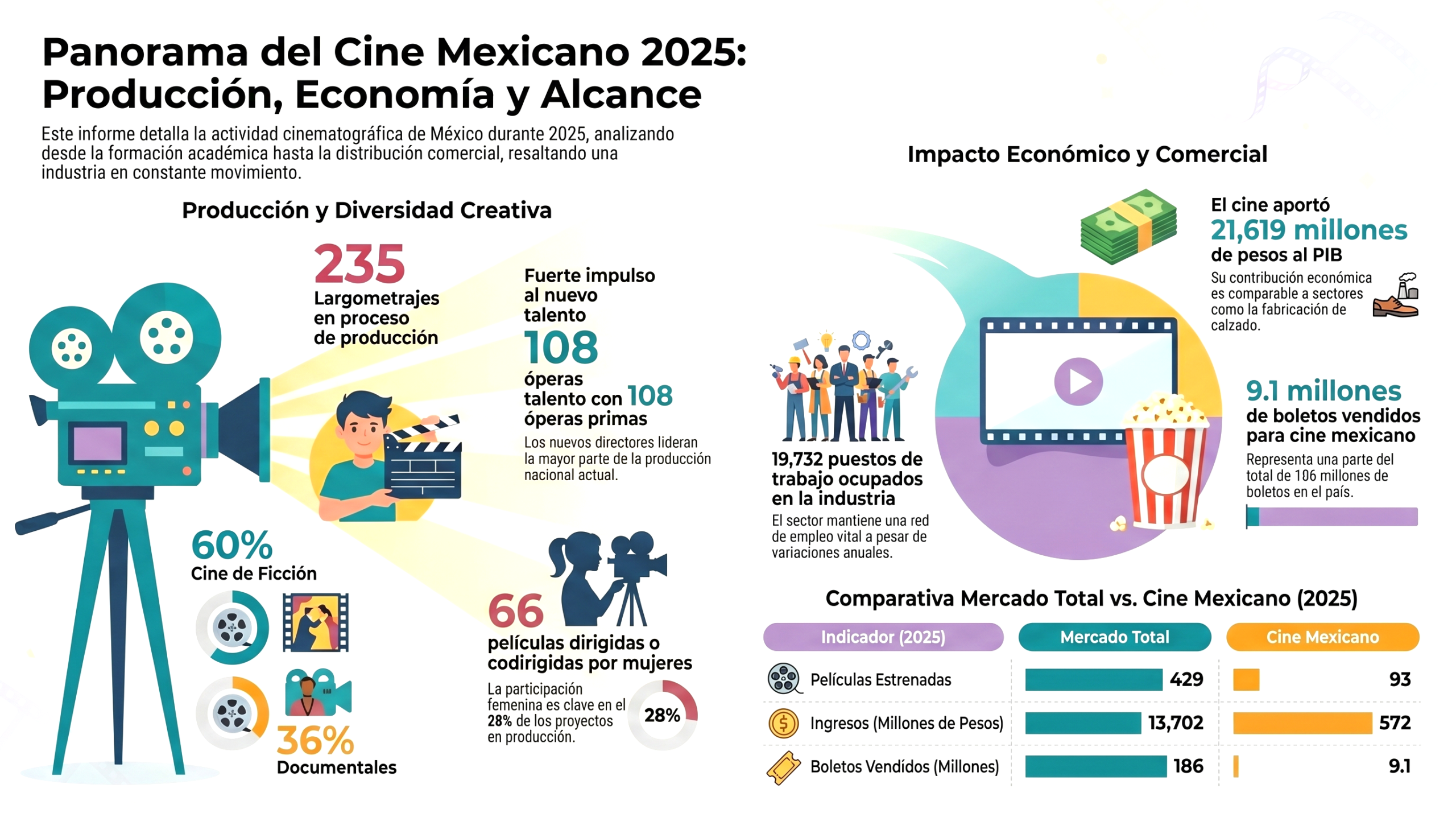 - PIB del Cine: Se situó en 21,619 millones de pesos, lo que representa aproximadamente el 0.07% del PIB nacional.